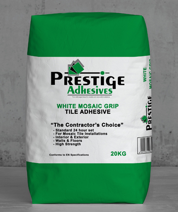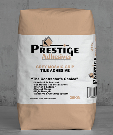 Prestige Grey Mosaic Grip tile adhesive is a super fine, cement-based adhesive and grout for the fixing and grouting of ceramic and fusion type glass mosaics. This product is suited for use in interior and exterior conditions, on walls and floors, and in dry and wet environments with thin bed applications.