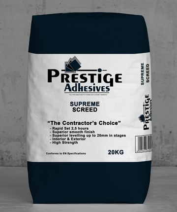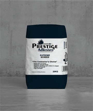 Prestige Supreme Screed is a rapid setting, shrinkage compensated cement-based self-levelling compound. It has been specifically formulated for the levelling and smoothing of rough or uneven substrates prior to the installation of floor coverings in high trafficked areas. Its rapid setting, high strength formulation has been designed to repair cement-based sub-floors including sand/cement screeds, and concrete floors. Once applied, the compound can be subject to light foot traffic after 2 to 3 hours, and floor coverings – such as epoxy coatings, tiles, vinyl and carpet – can typically be installed 24 hours after application, once the moisture content is 3% or less.